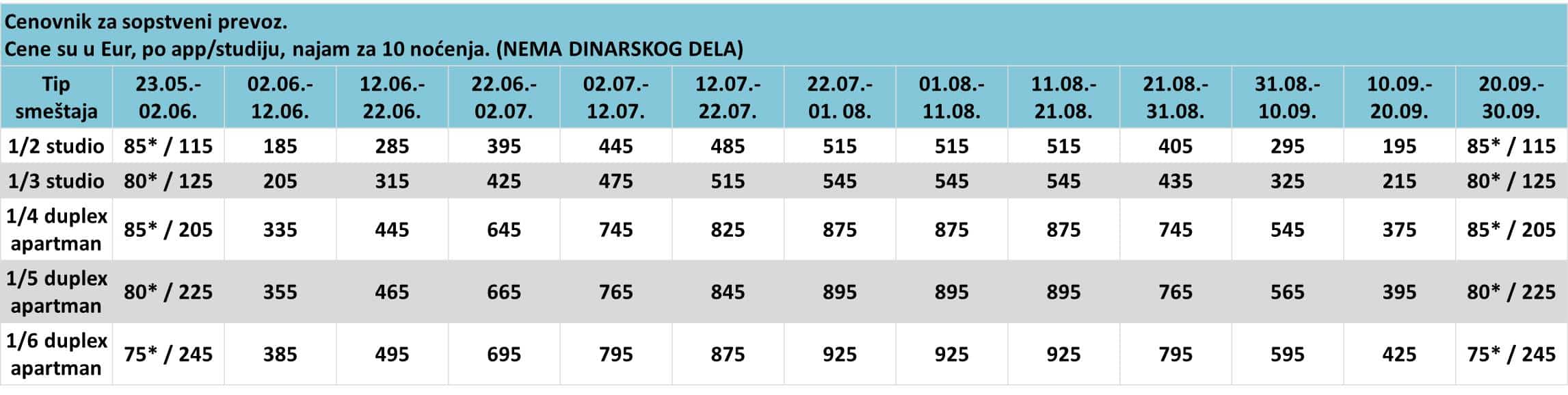 • Cenovnik u tabeli je PO SMEŠTAJNOJ JEDINICI bez prevoza za navedeni broj osoba.