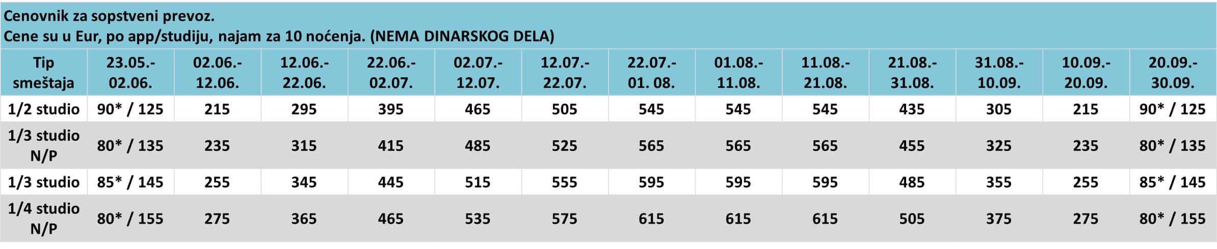• Cenovnik u tabeli je PO SMEŠTAJNOJ JEDINICI bez prevoza za navedeni broj osoba.