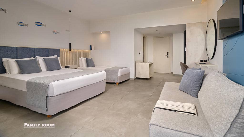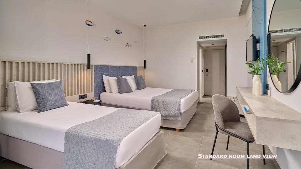 Hotel raspolaže sa 491 smeštajnih jedinica. Sve sobe u zakupu naše agencije se nalaze u glavnoj zgradi, imaju kupatilo sa tušem ili kadom, fen za kosu, Wi-Fi internet-besplatno, klima uređaj, SAT TV, telefon, frižider,sef-besplatno, balkon/terasu. Standard sobe land view površine su oko 18 m², namenjene za smeštaj dve odrasle osobe, dete i bebu ili tri odrasle osobe i bebu (beba-na upit), sadrže francuski ili dva standardna ležaja i po potrebi dodatni ležaj za treću osobu. Porodične sobe površine oko 26 m², mogu da prime maksimum 4 odrasle osobe ili troje odraslih, jedno dete i bebu, ili dvoje odraslih i dvoje dece i bebu. Sadrže francuski ležaj, jedan singl ležaj i jednu sofu, ili jedan francuski ležaj i dva signla, ili dva francuska ležaja. Minimalan broj putnika u ovom tipu sobe je 3. Sve sobe su dvokrevetne po svojoj osnovnoj strukturi, sastoje se od francuskog ili dva odvojena ležaja, dok ostali ležajevi mogu biti pomoćni. Bebi krevetac je na upit, besplatno.