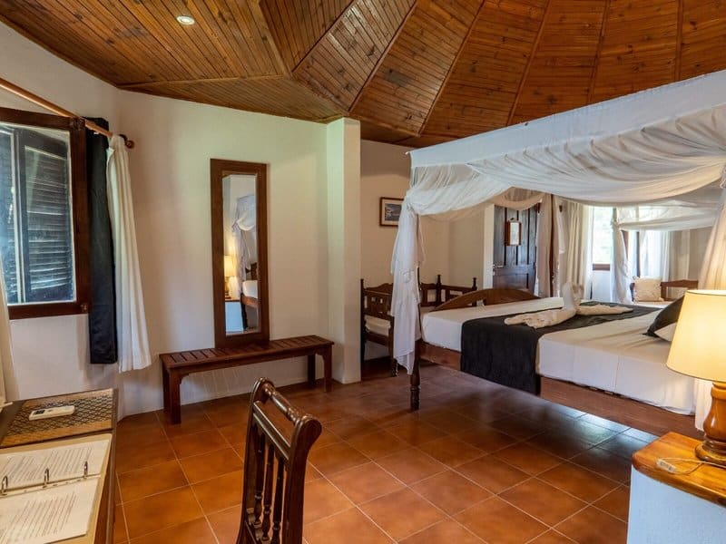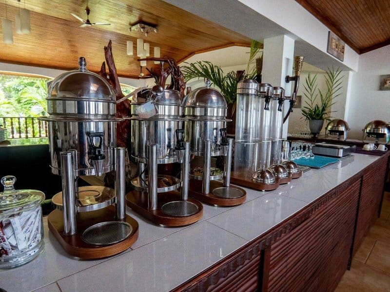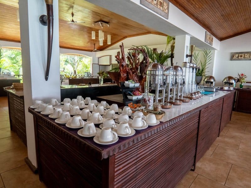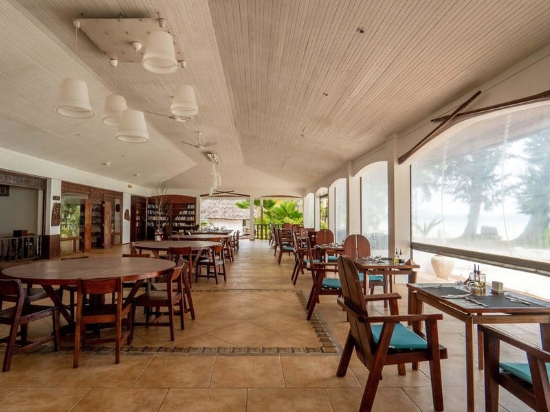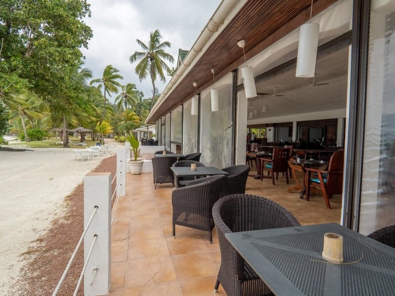 Gostima je omogućena rezervacija bez obroka, sa doručkom, polupansionom ili punim pansionom. Glavni restoran nudi bogat izbor kreolskih, italijanskih i međunarodnih jela, pripremljenih od svežih lokalnih sastojaka. Obroci se služe u jasno definisanim terminima – doručak od 07:00 do 10:00, ručak od 12:00 do 14:00, i večera od 19:00 do 21:30. Ambijent restorana odlikuje se jednostavnošću i toplinom, sa pogledom na tropsko zelenilo i more.