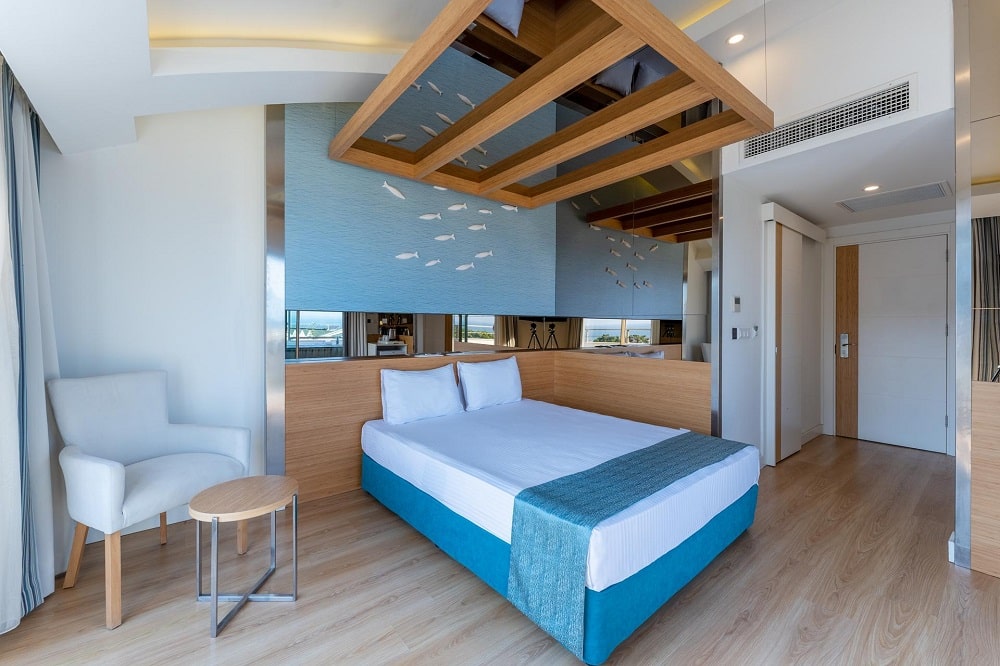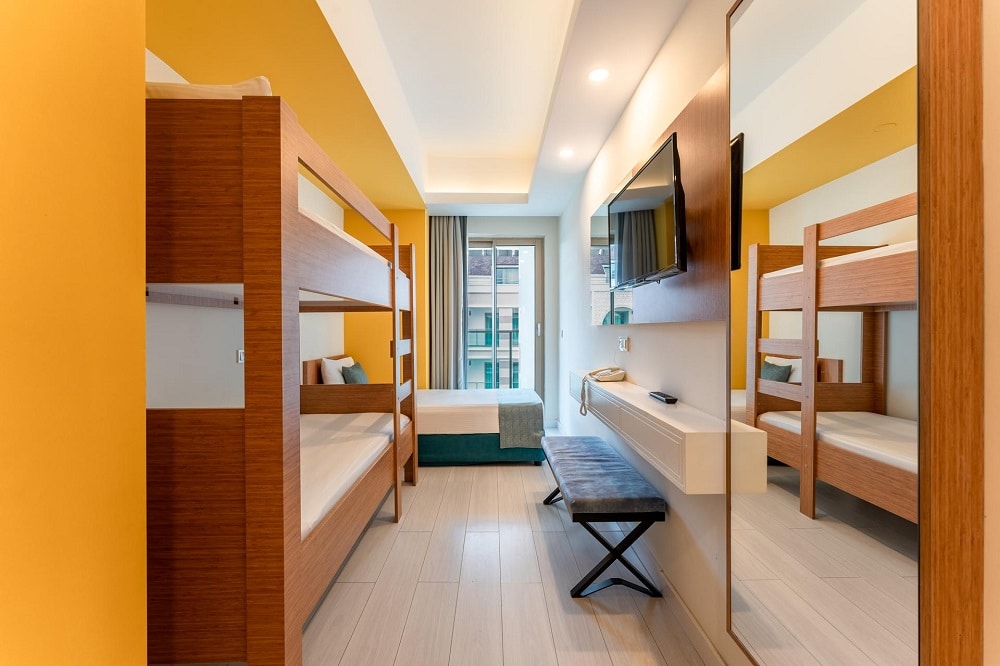 Hotel se sastoji iz glavne zgrade i garden dela i raspolaže sa: 440 soba sa standardnim sobama (mogu biti sa pogledom na kopno ili delimičnim pogledom na more, max 2+1 osoba, francuski ležaj ili dva odvojena kreveta, za dodatnu osobu/dete dodatni pomoćni ležaj, 22 m²) i stadardnim sobama u garden bloku (max 3 osobe, 26 m²), porodičnim sobama (sastoje se od 2 spavaće sobe, max 3+2 osobe, 33-44 m²), Standard Bunkbed (2+2 osobe, francuski ležaj ili dva odvojena kreveta, za decu kreveti na sprat, imaju površinu od 26 m²), swim up sobama (sastoje se od jedne spavaće sobe i poseduju terasu sa izlazom na bazen, 26 m²), love suites (sobe imaju površinu od 22m² sa većom terasom na kojoj se nalazi jacuzzi i imaju pogled na more i bazen). Sve sobe imaju: kupatilo, fen za sušenje kose, telefon (uz doplatu), sef (besplatno), TV, centralni klima uređaj, Wi-Fi, set za kafu/čaj, mini-bar, room service (uz doplatu), balkon.