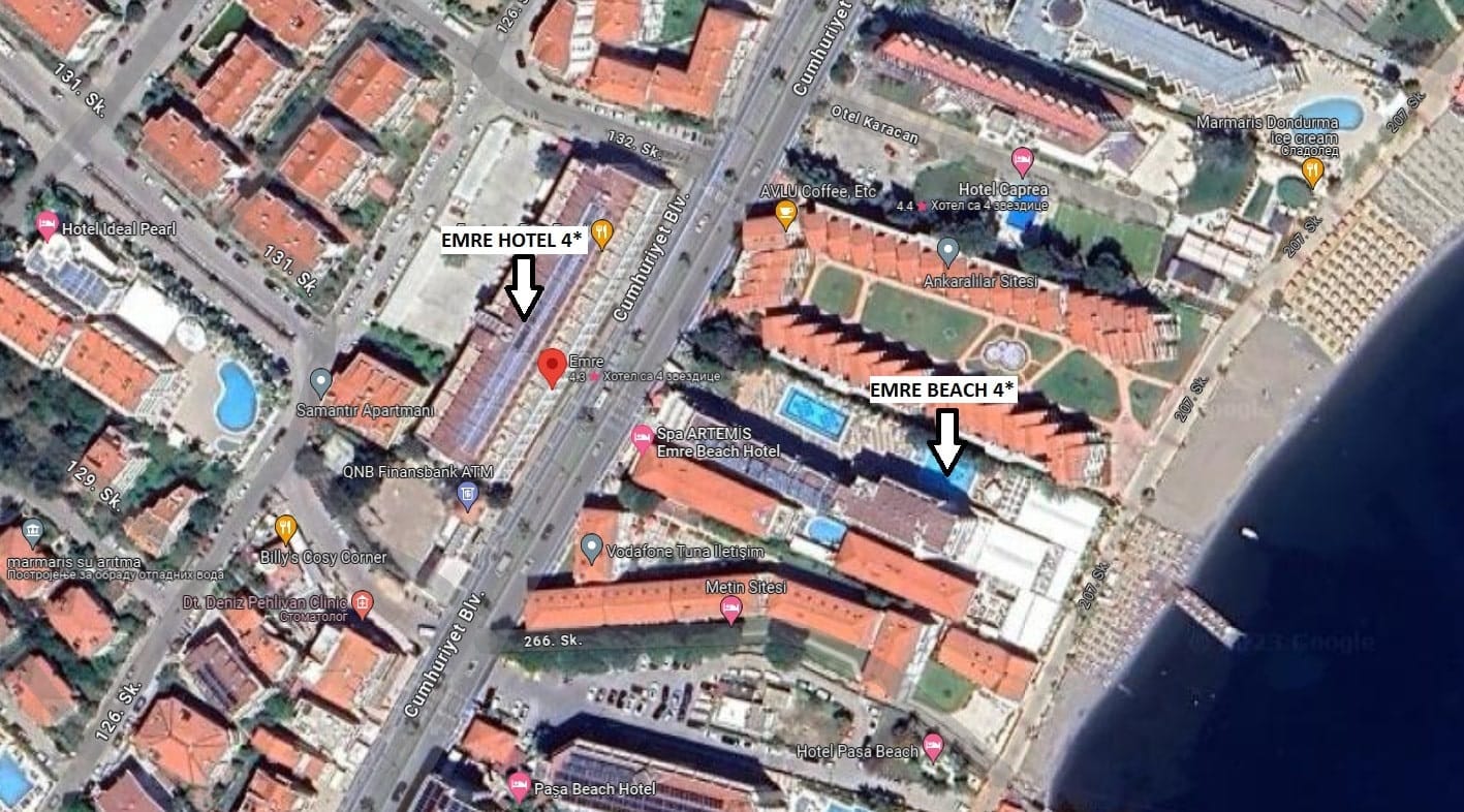 Hotel Emre i hotel Emre Beach su dva susedna hotela, nalaze se jedan preko puta drugog. Gosti koriste sve sadržaje, restoran i plažu u delu preko puta ulice – Emre Beach. Hotel se nalazi na 100 km od aerodroma u Dalamanu, a od centra Marmarisa udaljen je 3 km. Aerodrom u Bodrumu udaljen je oko 130 km od hotela. Izgrađen je 1987. a renoviran 2006. godine i obuhvata površinu od 2.900 m². Prijavljivanje gostiju se vrši u Emre Hotel zgradi.