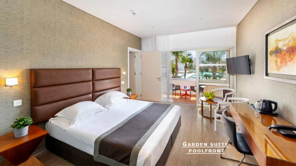 Garden suite sa pogledom na bazen veličine 32m2, maksimum 4 osobe, 2 odrasle + 2 dece, 3 odrasle, francuski krevet ili dva singl kreveta, pomoćni ležaj ili sofa (manjih dimenzija).