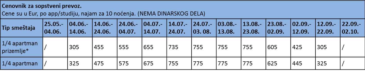 -Kod prodaje duple smene – prva smena gde je cena sa zvezdicom (*) i narednog termina, putnik plaća paket po osobi plus najam apartmana u sledećoj smeni. Isto važi i za poslednju smenu sa zvezdicom (*).