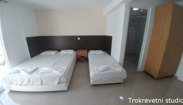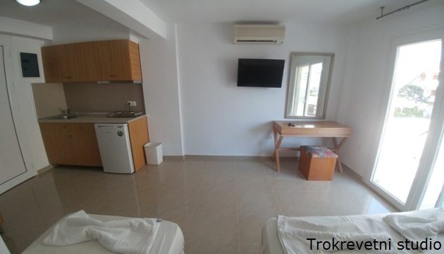 350m od plaže, novija moderno opremljea, smeštena oko 80m od centra. Poseduje kompletno opremljene studije i mezonete na dva nivoa za smeštaj do 4+1 osobe...