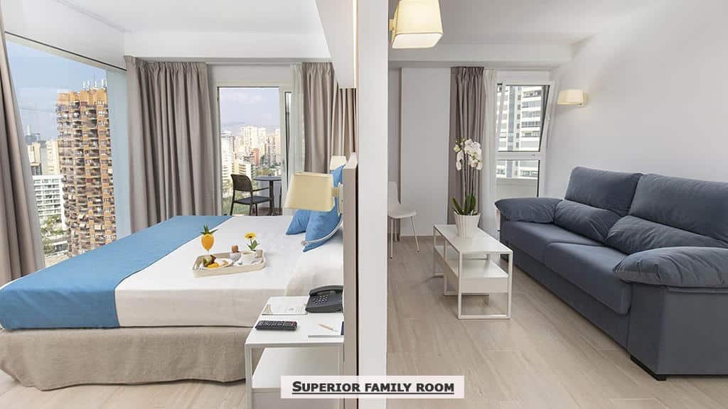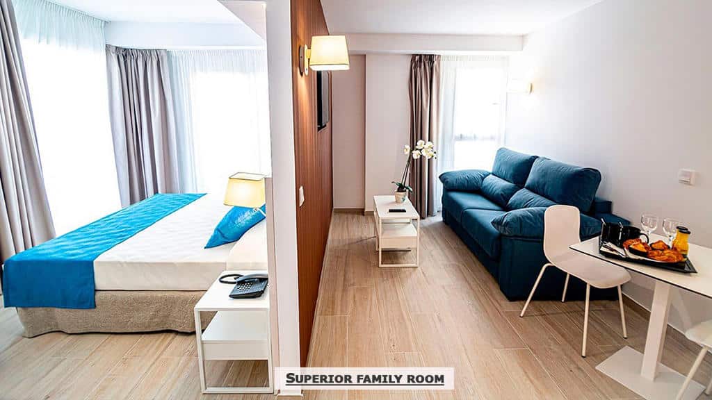 Superior porodične sobe I Superior porodične sobe pogled bazen, namenjene su za porodice do najviše četiri odrasle osobe, a najmanje za dvoje odraslih I jedno dete do 11,99 godina. Sadrže klima uređaj, grejanje, dva TV-a od 40″, sef (uz doplatu), odvojeni dnevni deo sa sofom na razvlačenje (140 cm) i deo opremljen mikrotalasnom pećnicom, sudoperom, frižiderom i ketlerom. Sobe su po strukturi dvokrevetne (francuski ležaj ili dva odvojena kreveta), dok je treći/četvrti ležaj, pomoćni. Jednokrevetna soba je namenjena za jednu osobu sa standardnim ležajem.