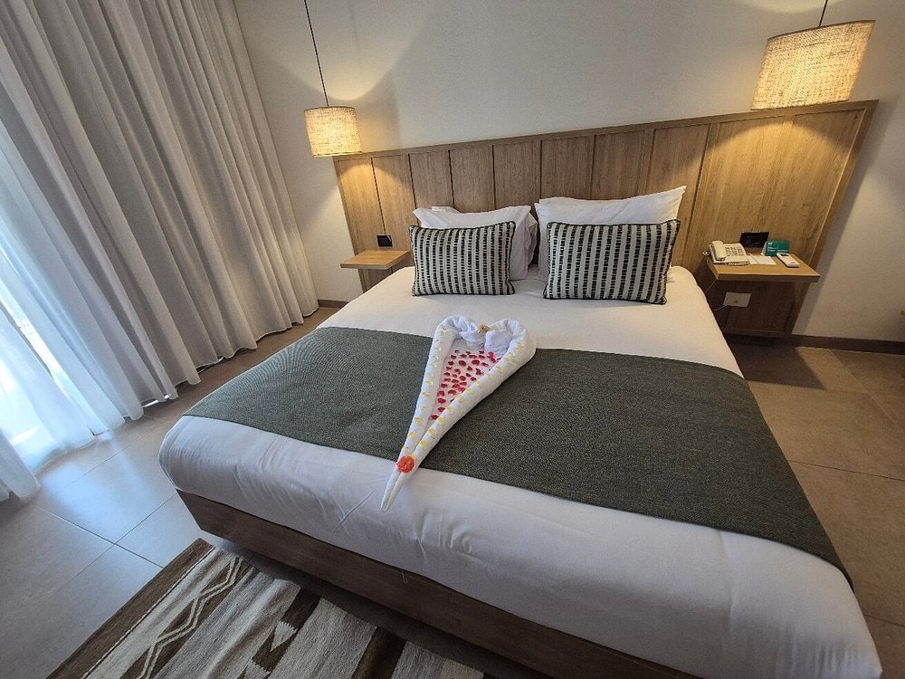 Sobe: Hotel Jaz Almaza Blue ima 150 smeštajnih jedinica. U ponudi su sobe sa pogledom na bazen i baštu, opremljene kupatilom (tuš kabinom), klima uređajem, fenom, TV, mini barom (uz doplatu) i sefom. Mini-bar i aparat za kafu i čaj se dopunjuje svakodnevno.