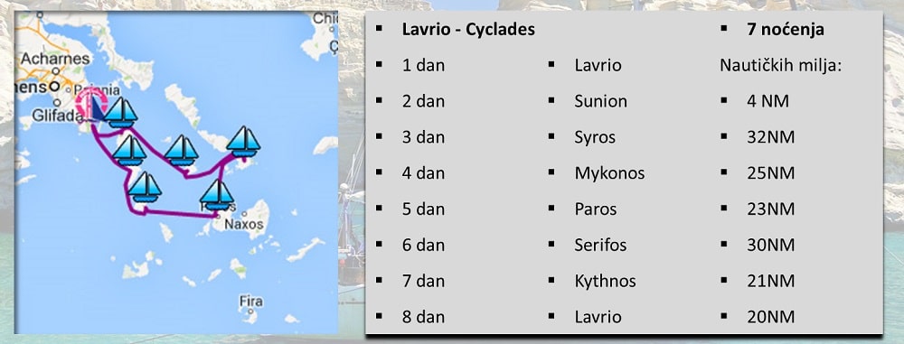 -Polasci su iz Lavrija ili ostrva PAROS, MIKONOS, MILOS- o čemu će putnici biti blagovremeno obavešteni najkasnije 3 dana do polaska.