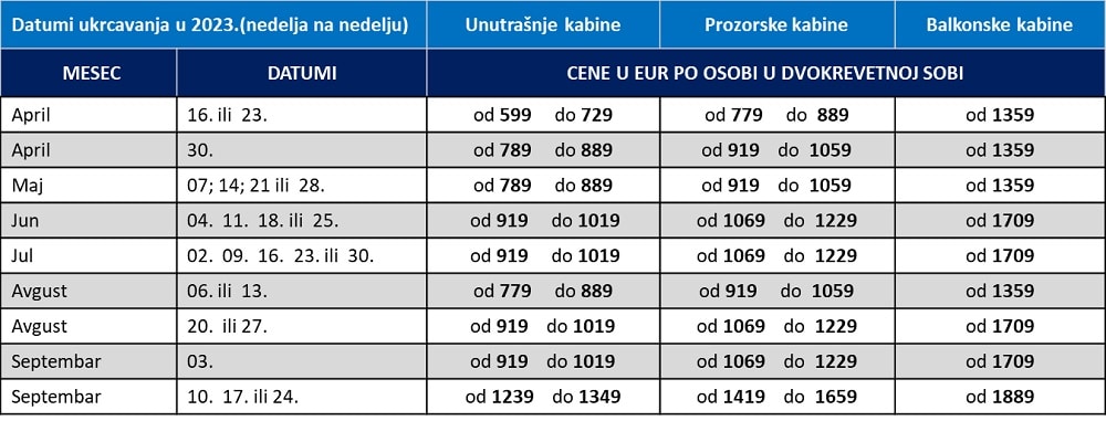 Cene su izražene u € po osobi za smeštaj u dvokrevetnoj kabini: