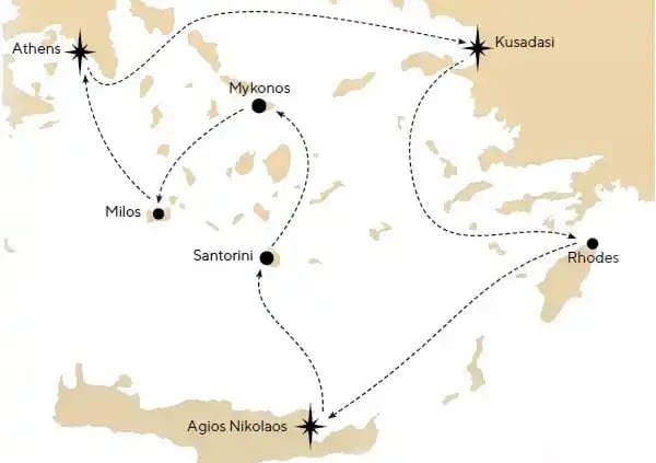 Atina – Kušadasi – Rodos – Krit – Mikonos – Santorini – Milos