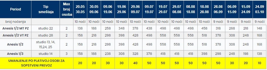 • Cene u tabeli su PO OSOBI i predstavljaju paket aranžman sa autobuskim prevozom i smeštajem za navedeni broj noćenja.