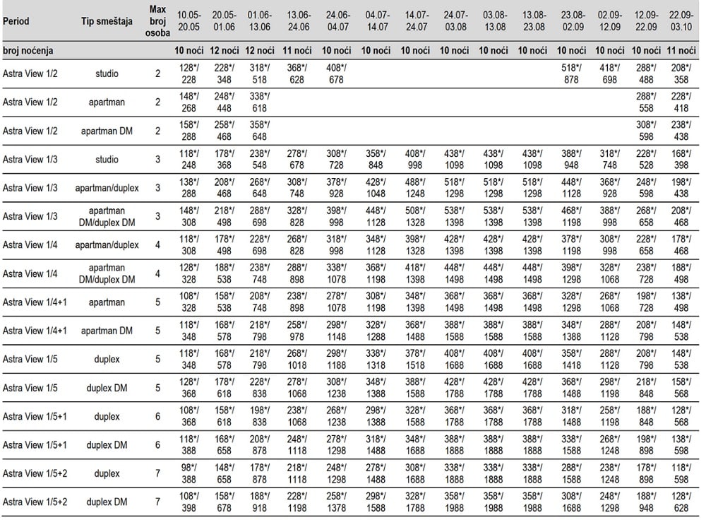 Broj noći | 10 noći | 10 noći | 10 noći | 10 noći | 10 noći | 10 noći | 10 noći | 10 noći | 10 noći | 10 noći | 10 noći | 9 noći | 9 noći | 9 noći | 9 noći |