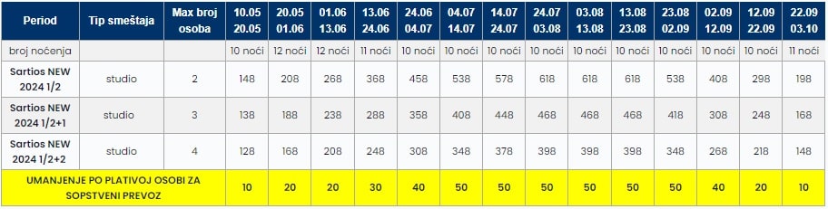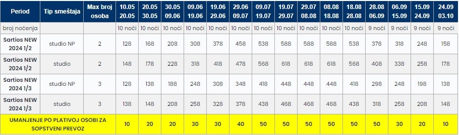 Za polazak iz Subotice, Sombora, Kikinde, Sente i Bačke Topole u julu i avgustu doplata je 30eur po osobi, a u maju, junu i septembru doplata je 20eur po osobi.