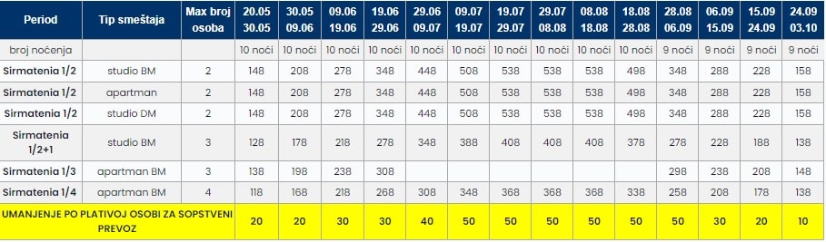 • Za polazak iz Subotice, Sombora, Kikinde, Sente i Bačke Topole u julu i avgustu doplata je 30eur po osobi, a u maju, junu i septembru doplata je 20eur po osobi.