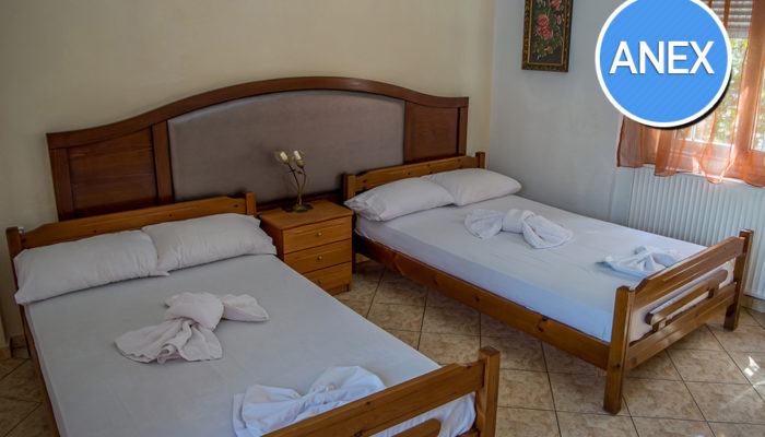 200 metara od prelepe peščane Agios Antonios plaže i 300 metara od centra i šetališta Potosa. Objakat u dvorištu sa maslinama, je prizemnog tipa, a u ponudi su kompletno opremljeni dvokrevetni i trokrevetni studiji...