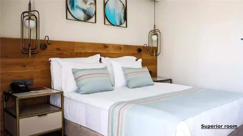 Sobe: Hotelski kompleks čine dve petospratne zgrade i superior vila koje raspolažu sa sa 276 soba koje se dele na: 203 standardne sobe (od toga su dve za osobe sa posebnim potrebama, max 3 osobe, francuski lezaj ili dva odvojena kreveta, za dodatnu osobu/dete dodatni pomocni lezaj, 30 m²), 5 superior soba u glavnoj zgradi (max 2 osobe, francuski lezaj ili dva odvojena kreveta, 34 m²), 12 superior soba u vilama (max 2+1 osoba, francuski lezaj ili dva odvojena kreveta, za dodatnu osobu/dete dodatni pomocni lezaj, 32 m²), 18 porodičnih soba (max 3+1 osoba, francuski lezaj ili dva odvojena kreveta , za dodatne osobe/decu dobija se dodatni pomocni lezaj ili sofa na razvlacenje, 35 m²) i 12 superior porodičnih soba (2 sobe odvojene vratima, max 4 osobe, jedna soba francuski lezaj ili dva odvojena lezaja, druga soba francuski lezaj ili dva odvojena lezaja/ili sofa na razvlacenje , 42 m²). Svaka soba ima: centralni klima uređaj, kupatilo, fen, Wi-Fi internet (uz doplatu), TV, telefon, mini-bar (besplatno), sef (besplatno), balkon.