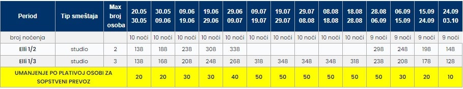 • Za polazak iz Subotice, Sombora, Kikinde, Sente i Bačke Topole u julu i avgustu doplata je 30eur po osobi, a u maju, junu i septembru doplata je 20eur po osobi.