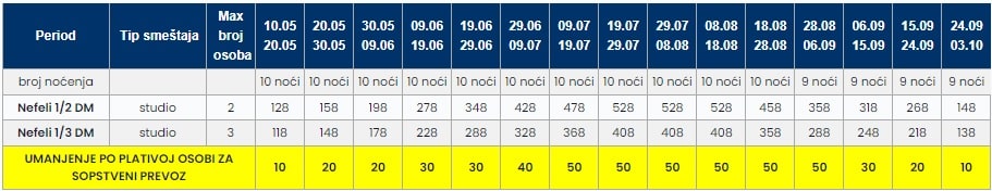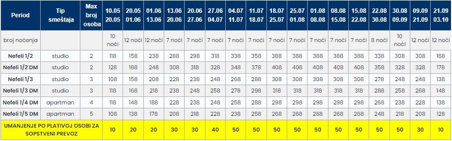 • Cene u tabeli su PO OSOBI i predstavljaju paket aranžman sa autobuskim prevozom i smeštajem za navedeni broj noćenja.