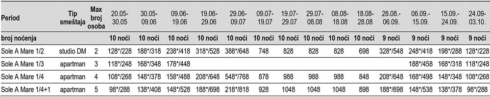 Cene su za najam studija/apartmana za navedeni broj noći i maksimalan broj osoba bez obzira na uzrast. Pored navedenog broja osoba bez posebne doplate i bez sopstvenog ležaja može boraviti dete do 6 godina. Dete starije od 6 godina, a mlađe od 12 godina može boraviti pored maksimalnog broja osoba u apartmanu bez sopstvenog kreveta uz doplatu od 5eur/danu. Postoje kuće u kojima boravak više od maksimalnog broja osoba nije moguć ni uz doplatu. Pored takvih kuća, ovo nije moguće ni u 1/2+1, 1/2+2,1/3+1 ,1/4, 1/5 studijima, 1/4+1 apartmanima, 1/5+1 duplexima.