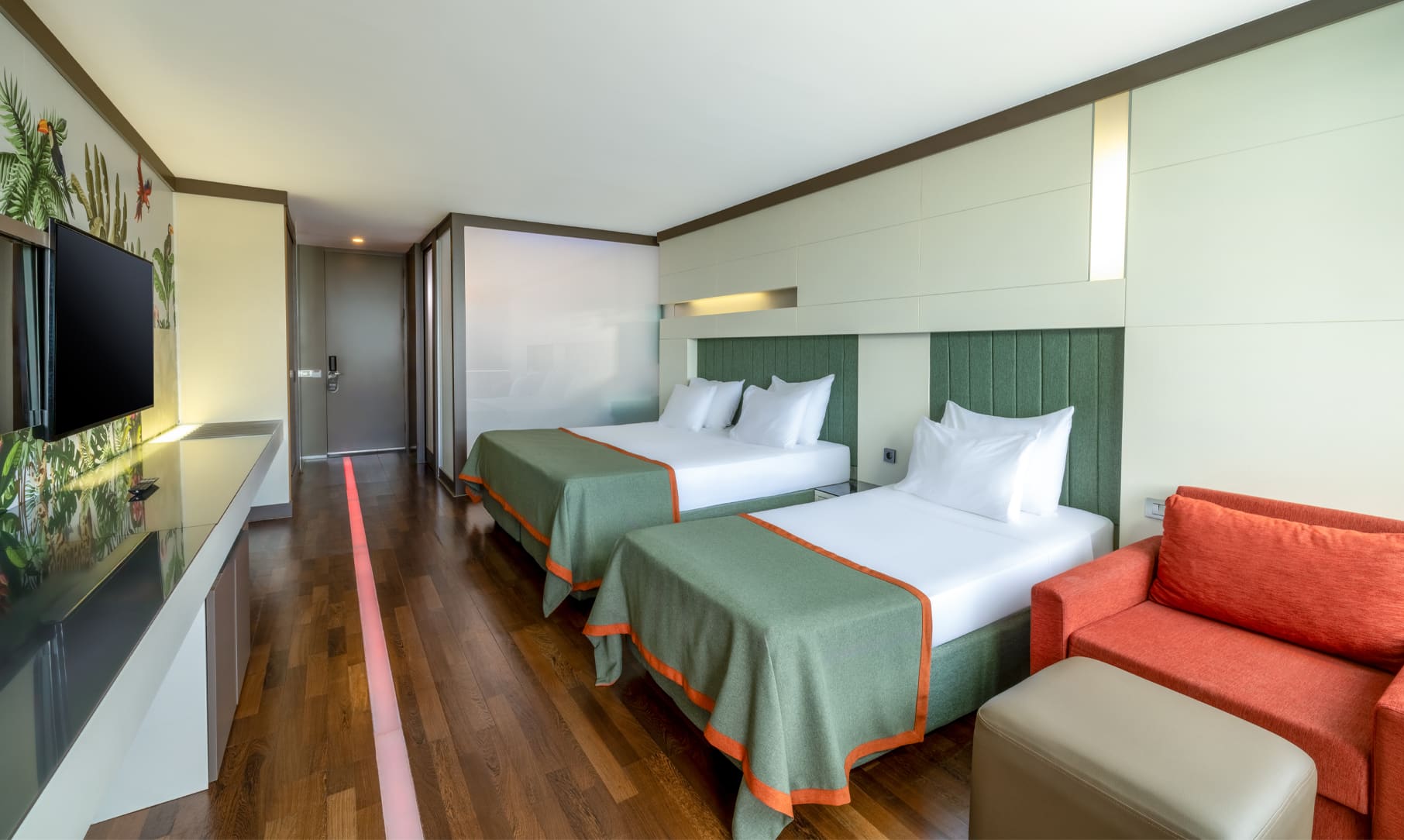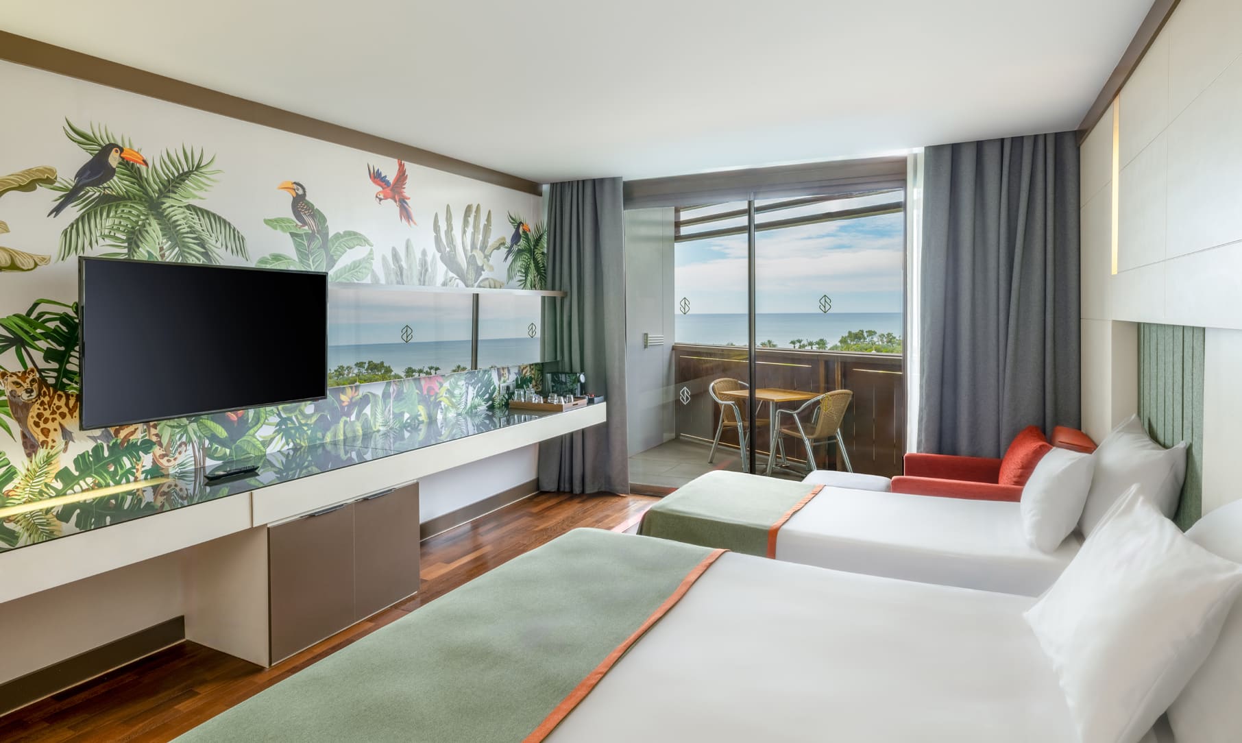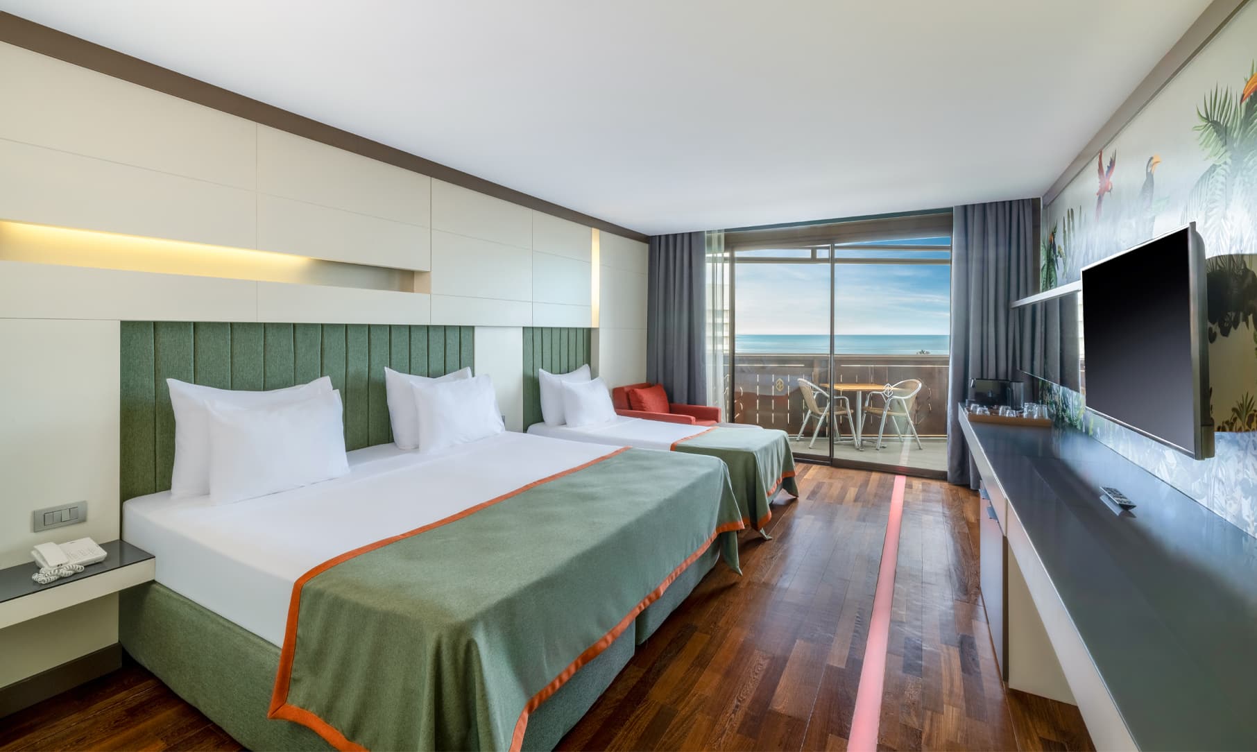 Sobe: U glavnoj devetospratnoj zgradi raspolaže sa 513 standardnih soba, od čega je 6 soba za osobe sa posebnim potrebama (max 3+1 osobe, francuski ležaj ili dva odvojena kreveta, za dodatne osobe/decu dobija se dodatni pomoćni ležaj ili sofa na razvlačenje, 32 m²), 48 dvosobnih family jedinica (sastoji se od spavaće sobe i odvojene dnevne sobe, 2 kupatila, za max 2+2 osobe, 56 m2), 16 junior suite room (sastoji se od spavaće sobe, dnevne sobe odvojene vratima i 2 kupatila, max 4 osobe, 51 m2), 2 trosobna King apartmana (sastoji se od 2 spavaće sobe, dnevnog boravka, 2 kupatila, za max 2 osobe, 116 m2). Svaka soba ima: kupatilo, fen za sušenje kose, centralni klima uređaj, telefon, TV, mini bar (bezalkoholna pića- besplatno), sef (besplatno), internet Wi-Fi (besplatno), room service (plaća se), balkon.