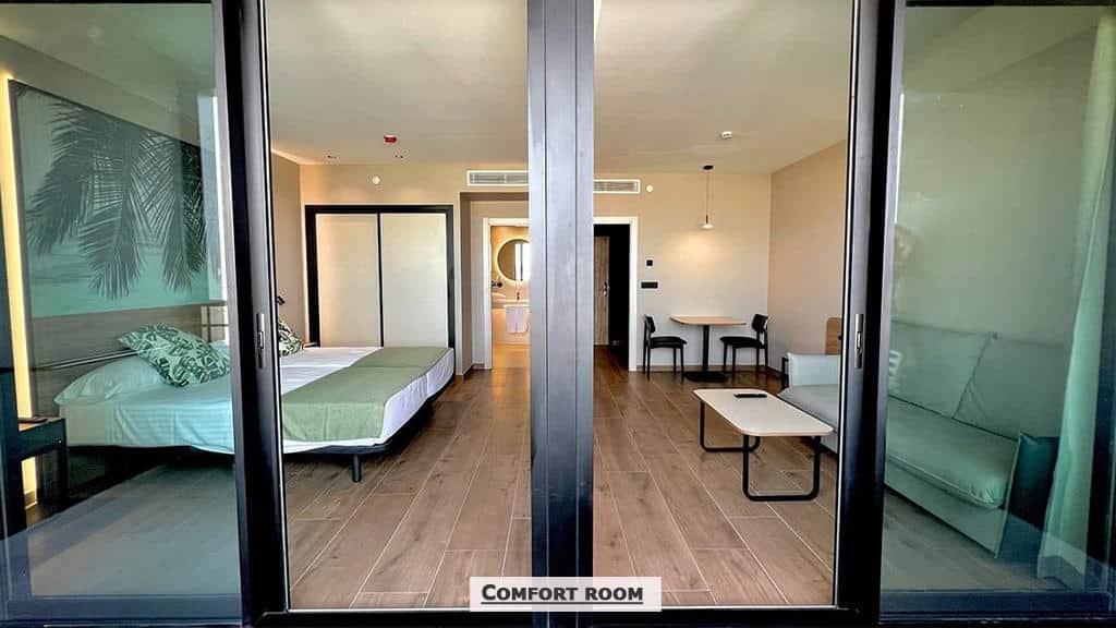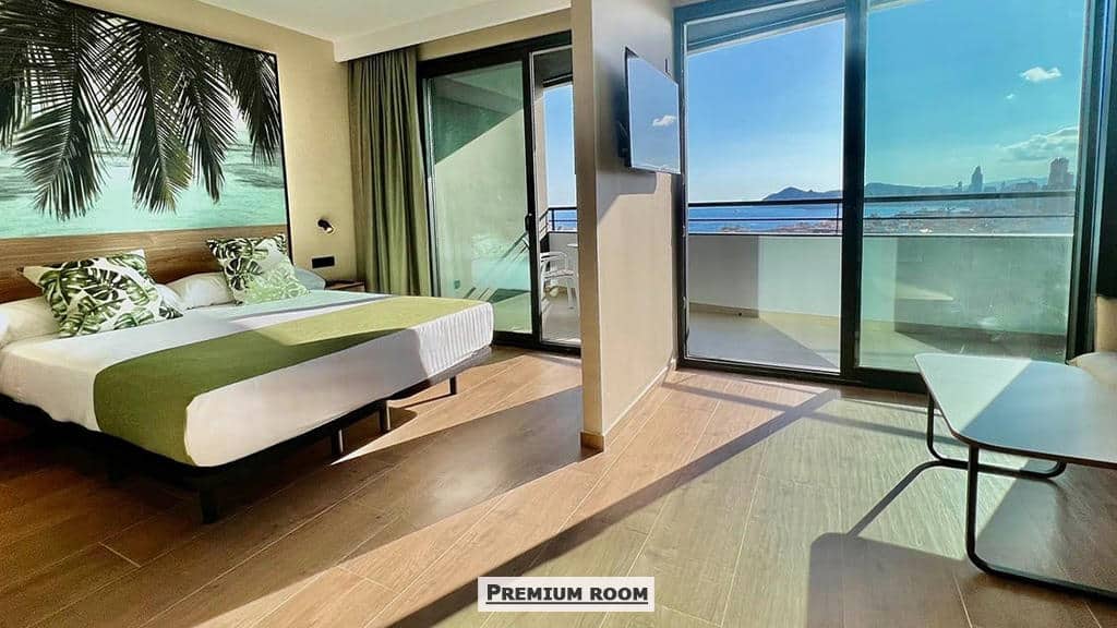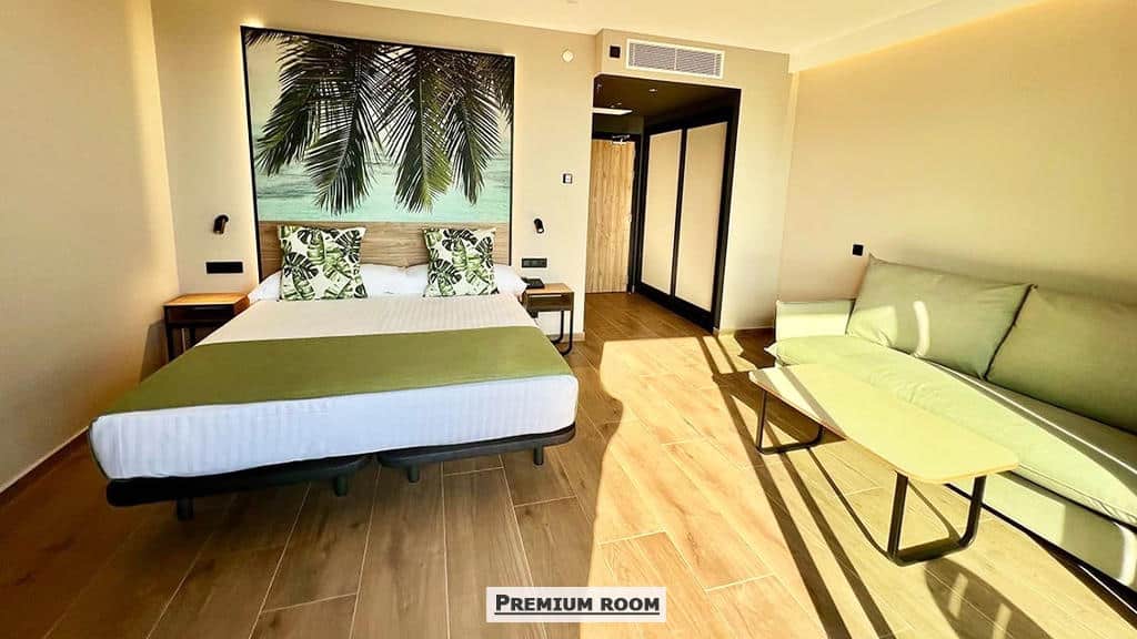 Premium sobe pogled bazen sa terasom (30m2) za dve do tri osobe ili za troje odraslih I jedno dete, sa king size krevetom I sofom na razvlačenje. Ove sobe mogu imati pogled na bazen ili na more, agencija ne može garantovati pogled;