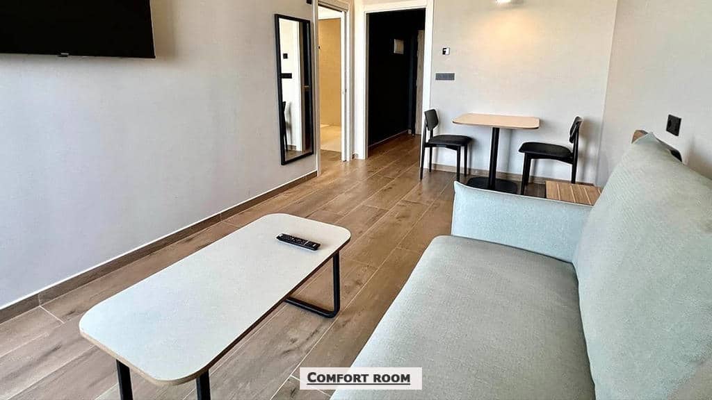 Komfort sobe (oko 30m2) za dve do četiri osobe, odvojena spavaća soba i dnevna soba, sa francuskim ležajem i sofom na razvlačenje. Soba poseduje takođe i mirkotalasnu pećnicu, frižider i aparat za kafu;