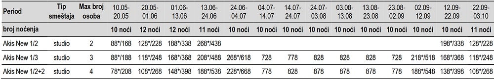 • Smeštaj na bazi 7/10/11/12 noćenja u izabranom objektu u studijima/apartmanima/mezonetama;