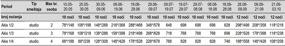 • Smeštaj na bazi 7/10/11/12 noćenja u izabranom objektu u studijima/apartmanima/mezonetama;