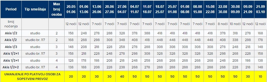 • Smeštaj na bazi 7/10/11/12 noćenja u izabranom objektu u studijima/apartmanima;