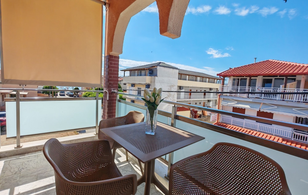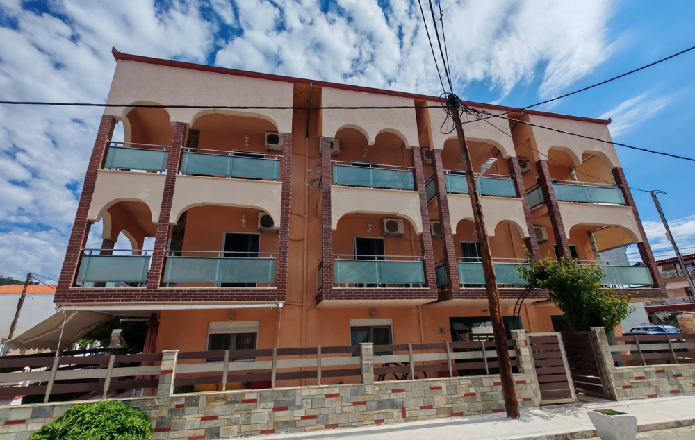 Nalazi se u novom delu Sartija na oko 80m od najlepšeg dela peščane plaže u Sartiju. Apartmani za 2 ili 3 osobe se nalaze na drugom spratu, a glavni kvalitet je kuhinja odvojena od spavaće sobe kao i zajednički prostor u prizemlju sa toaletom, izuzetno koristan na dan povratka. Kuća ima SAT TV, signal za besplatan bežični internet i klima uređaje čije se korišćenje posebno doplaćuje. Neki od apartmana imaju bočni pogled na more.