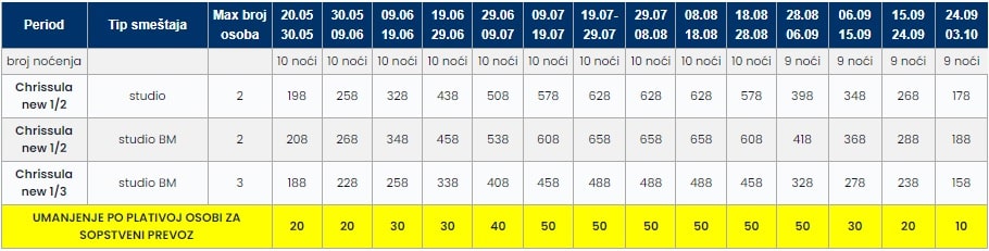 • Cene u tabeli su PO OSOBI i predstavljaju paket aranžman sa autobuskim prevozom i smeštajem za navedeni broj noćenja.