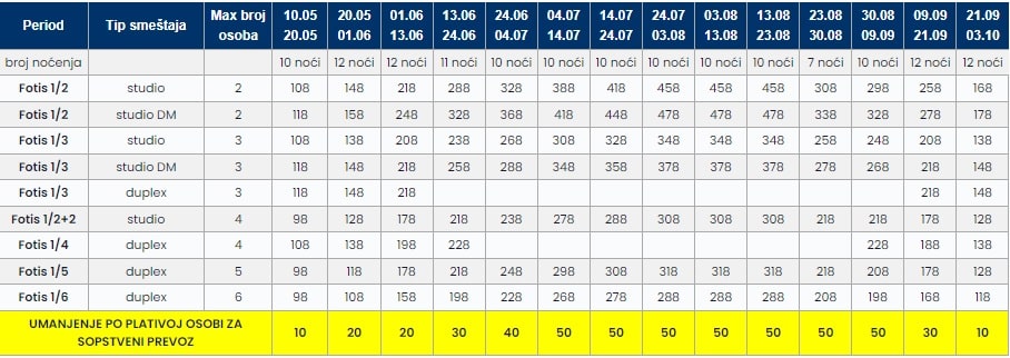 • Cene u tabeli su PO OSOBI i predstavljaju paket aranžman sa autobuskim prevozom i smeštajem za navedeni broj noćenja.