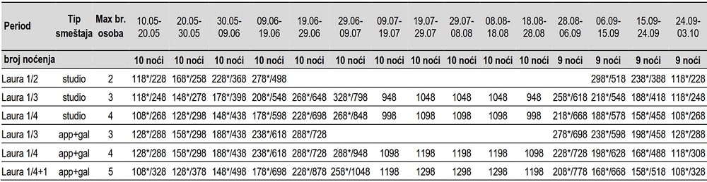 Broj noći | 10 noći | 10 noći | 10 noći | 10 noći | 10 noći | 10 noći | 10 noći | 10 noći | 10 noći | 10 noći | 10 noći | 9 noći | 9 noći | 9 noći | 9 noći |