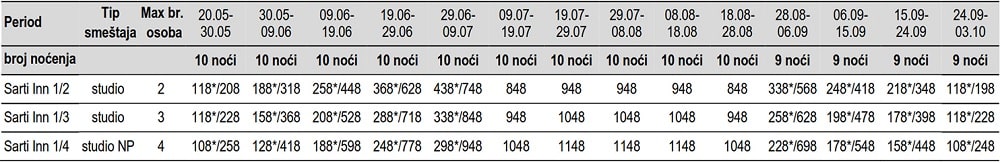 Broj noći | 10 noći | 10 noći | 10 noći | 10 noći | 10 noći | 10 noći | 10 noći | 10 noći | 10 noći | 10 noći | 9 noći | 9 noći | 9 noći |