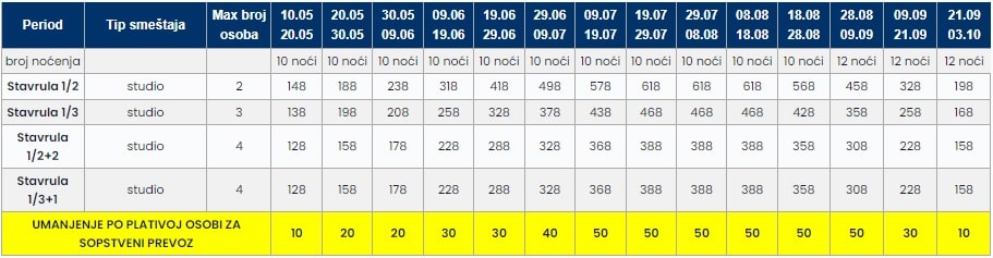 • Cene u tabeli su PO OSOBI i predstavljaju paket aranžman sa autobuskim prevozom i smeštajem za navedeni broj noćenja.