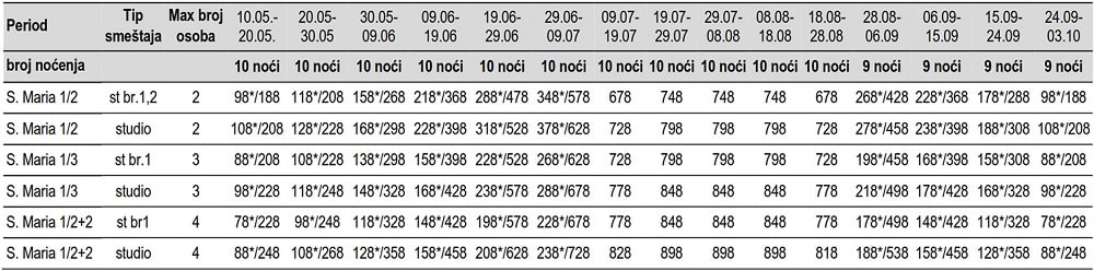 • Smeštaj na bazi 7/10/11/12 noćenja u izabranom objektu u studijima/apartmanima/mezonetama;