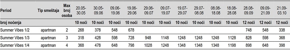Cene su za najam studija/apartmana za navedeni broj noći i maksimalan broj osoba bez obzira na uzrast. Pored navedenog broja osoba bez posebne doplate i bez sopstvenog ležaja može boraviti dete do 6 godina. Dete starije od 6 godina, a mlađe od 12 godina može boraviti pored maksimalnog broja osoba u apartmanu bez sopstvenog kreveta uz doplatu od 5eur/danu. Postoje kuće u kojima boravak više od maksimalnog broja osoba nije moguć ni uz doplatu. Pored takvih kuća, ovo nije moguće ni u 1/2+1, 1/2+2,1/3+1 ,1/4, 1/5 studijima, 1/4+1 apartmanima, 1/5+1 duplexima.