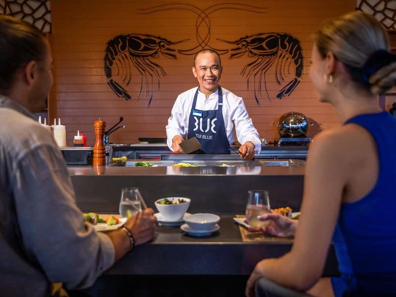 Puni pansion obuhvata doručak, ručak i večeru, dok all inclusive opcija dodatno uključuje užine i veliki izbor alkoholnih i bezalkoholnih pića tokom dana. Glavni restoran nudi tematske večere, live cooking stanice i opcije prilagođene različitim dijetetskim režimima. Posebna pažnja posvećena je BLUEf!t® konceptu ishrane sa fokusom na zdrav stil života.