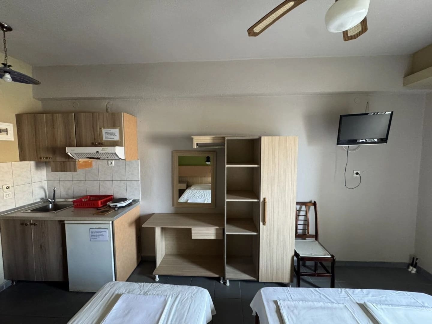 Sve smeštajne jedinice, sem soba (koje imaju samo frižider), su opremljene malom čajnom kuhinjom (frižider, mini električni šporet, posuđe bez tiganja), kupatilom, prostranim terasama, TV-om, kao i klima uređajem čije korišćenje se doplaćuje 5€ po danu. Kod aranžmana na 7 noći nema zamene posteljine.