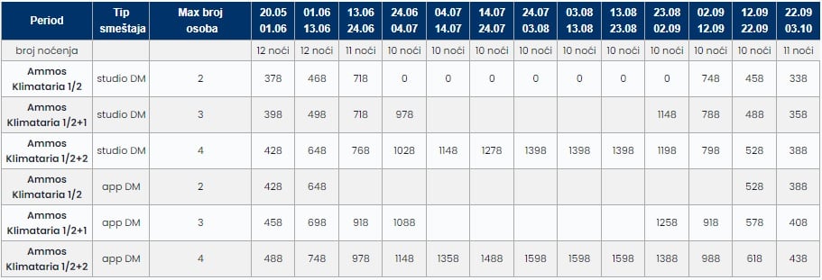 • Cene iz tabele predstavljaju ukupnu cenu najma PO SMEŠTAJNOJ JEDINICI za navedeni broj osoba u navedenom terminu i ne postoji umanjenje za sopstveni prevoz.