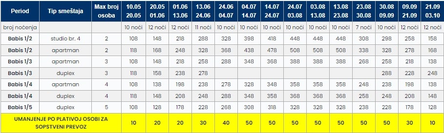 • Cene u tabeli su PO OSOBI i predstavljaju paket aranžman sa autobuskim prevozom i smeštajem za navedeni broj noćenja.