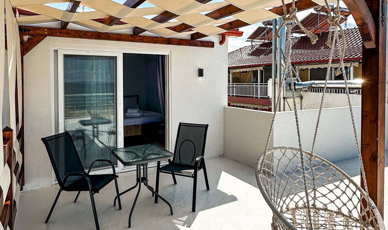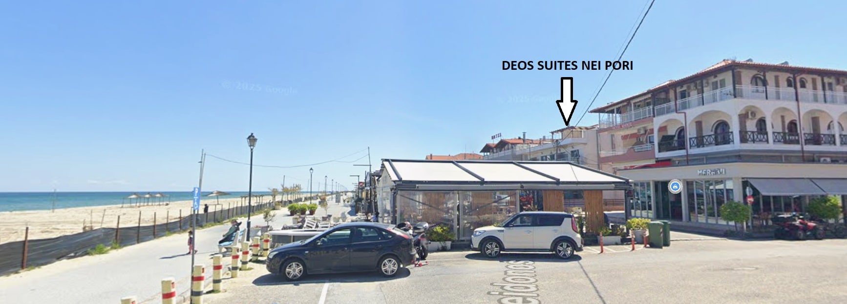 Vila Deos Suites je smeštena na samoj obali mora u Nei Poriju u centru novog dela Nei Porija pored poznate vile Marabu i iznad picerije Volcano.