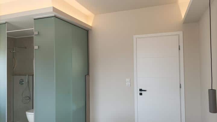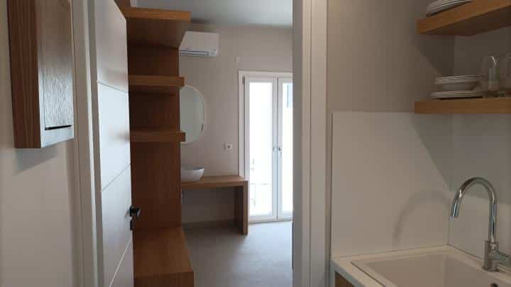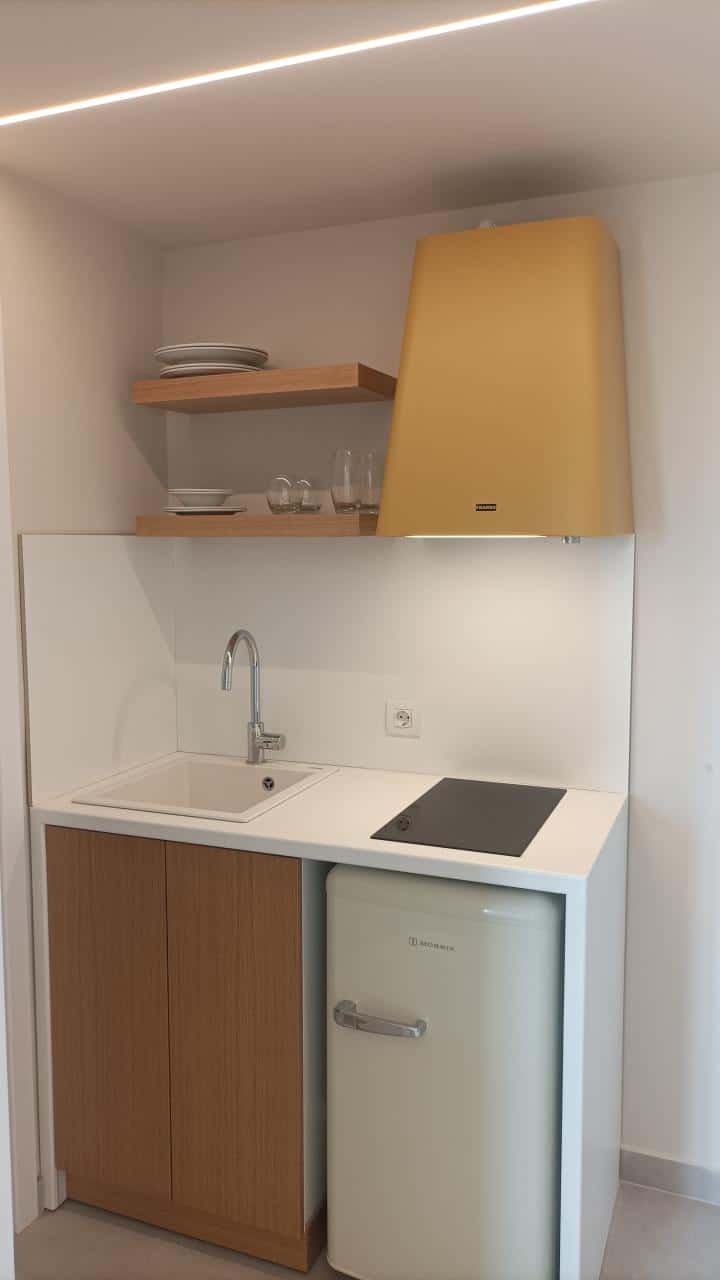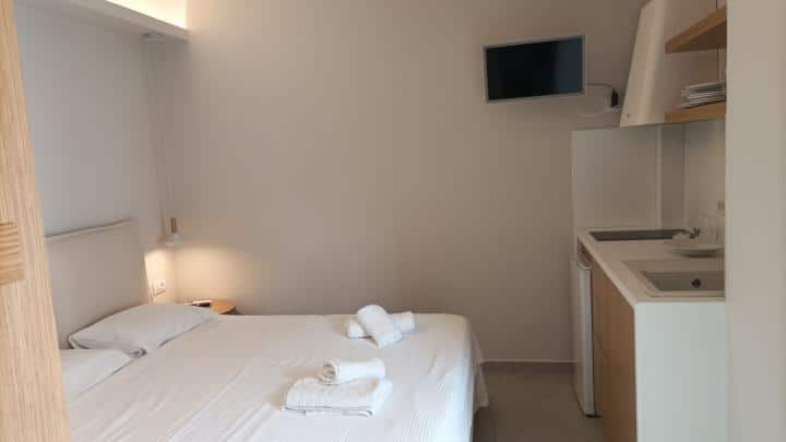 DVOKREVETNI STUDIJI: Dvokrevetni studiji se sastoje od dva singl ležaja ili francuskog ležaja,noćnih stočića, ormara, TV, klima uređaja (korišćenje uz doplatu na licu mesta), kuhinje sa dve ringle i frižiderom i neophodnim posuđem za dve osobe. Kupatilo je sa Tuš/wc-om. Studiji na spratu poseduju sopstvene terase.
