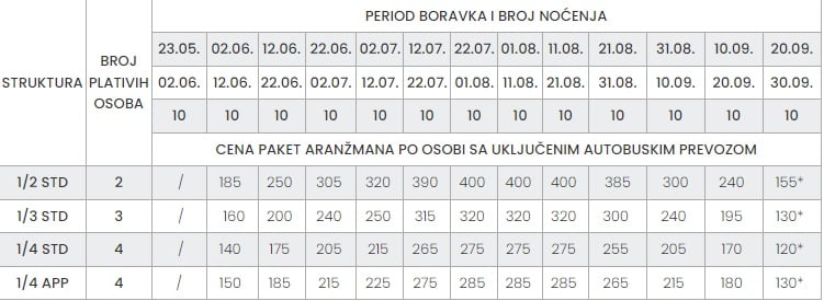 – u slučaju spajanja smena, cena se umanjuje za 30€ po osobi na ukupnu cenu paket aranžmana. Oism u smenama označenim *, u smenama označenim * nema umanjenja za spajanje smena.