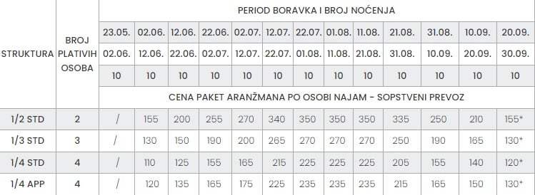 Cene u tabeli su iskazane u evrima PO OSOBI.