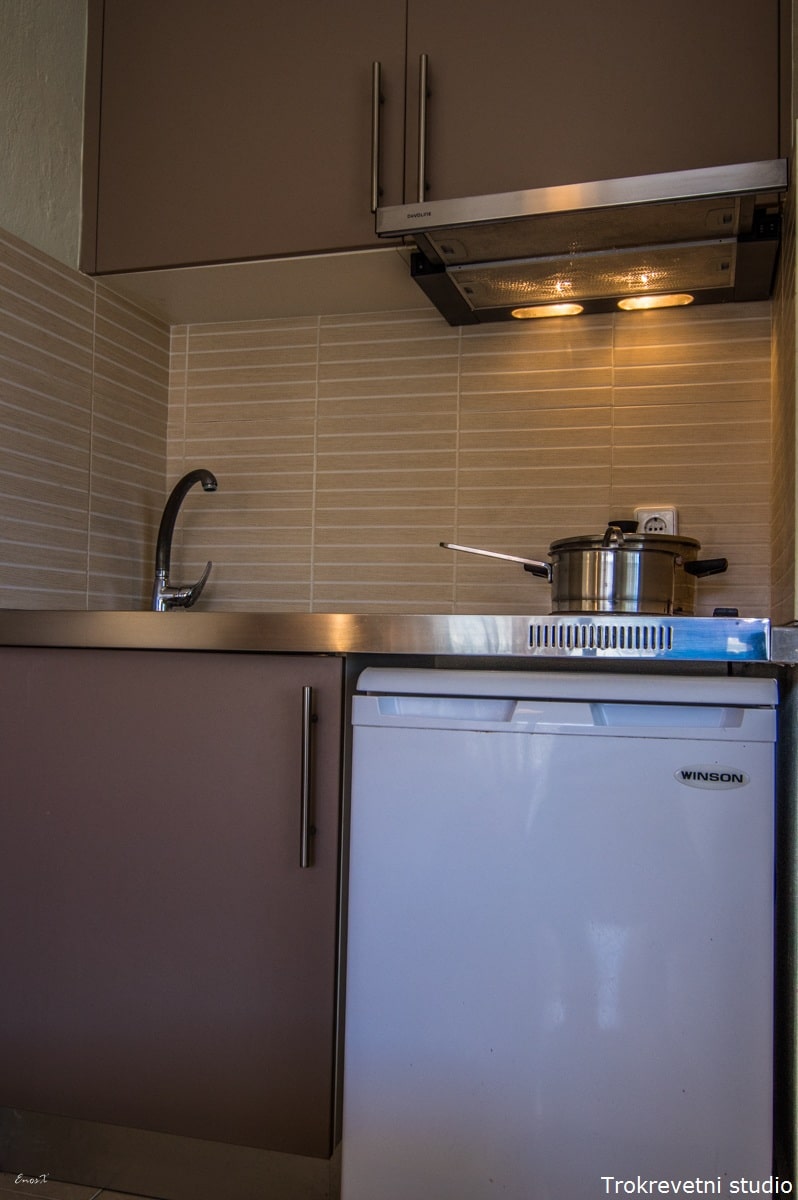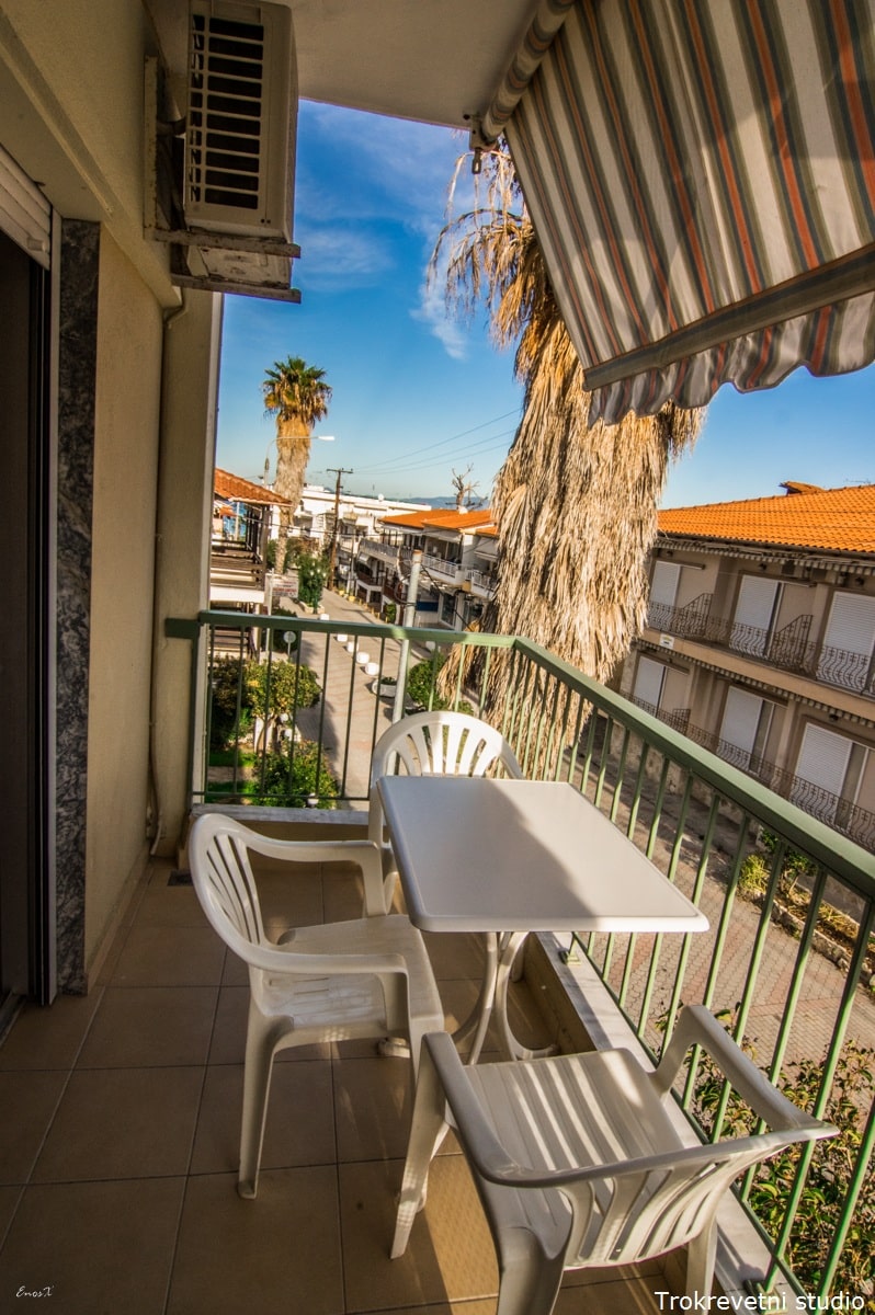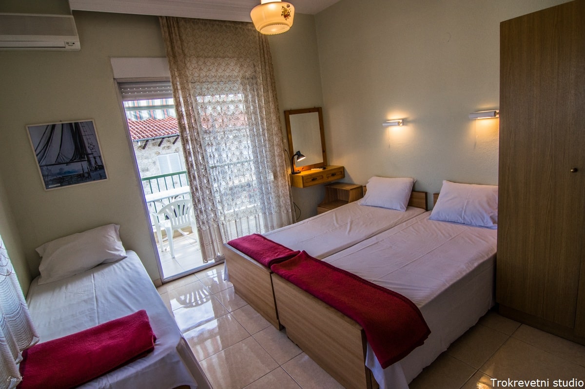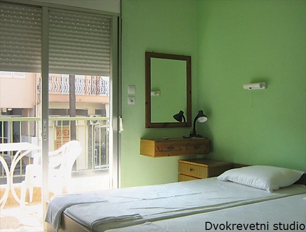 U ponudi imamo dvokrevetne i trokrevetne studije, koji imaju pogled ka ulici ili ka dvorištu. Dvokrevetni studio označen sa * je opremljen francuskim ležajem i ima pogled pozadi, na zid susedne vile.