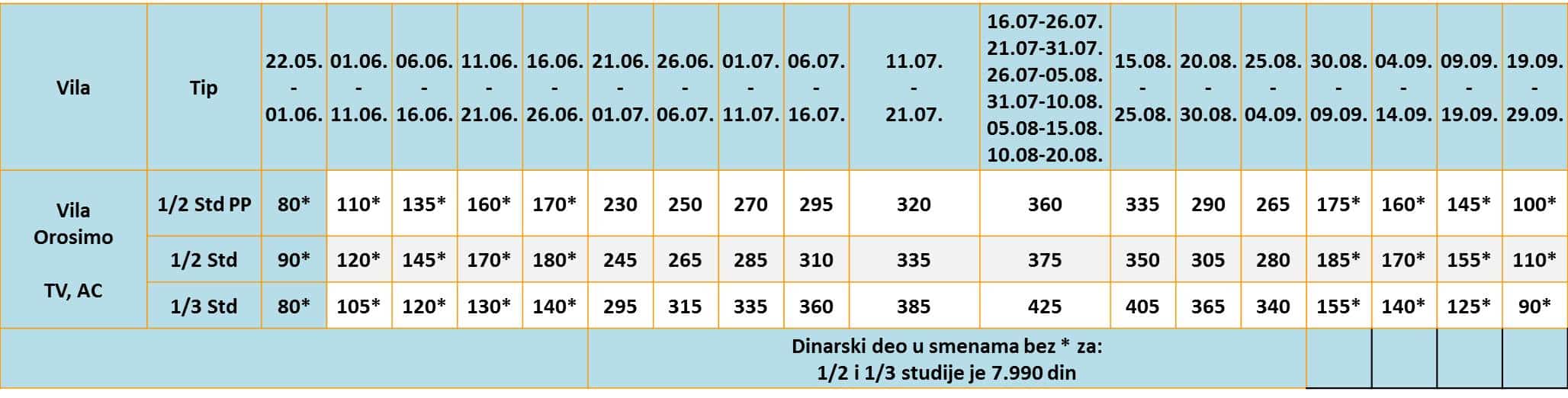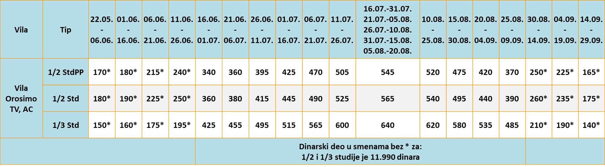 • U slučaju spajanja smena na organizovanom prevozu, cena aranžmana za drugu smenu se umanjuje za 25€ po osobi osim za smene koje su u tabeli označene zvezdicom (*).