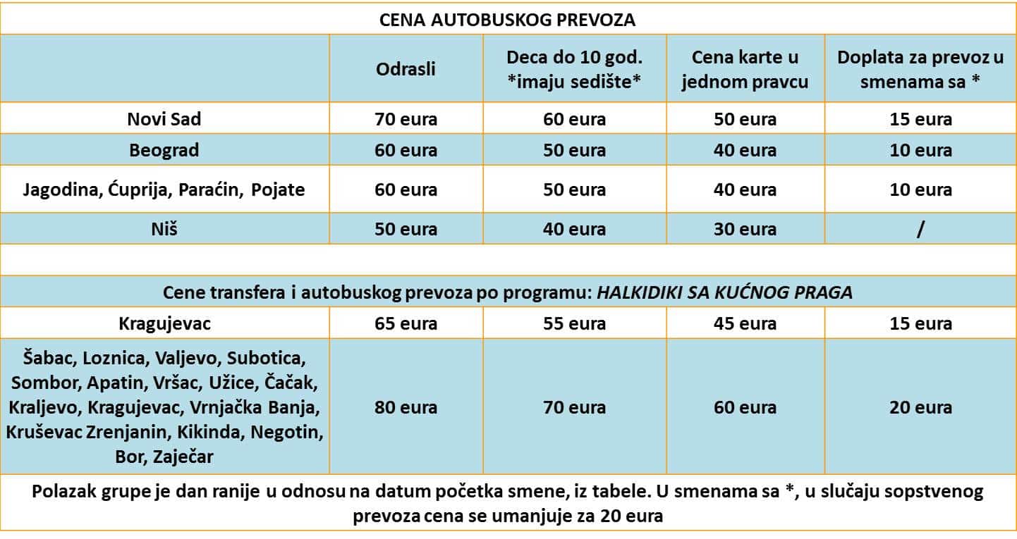 • Cenovnik u tabeli PO OSOBI predstavlja cenu paket aranžmana, smeštaj 10 noćenja + bus prevoz.