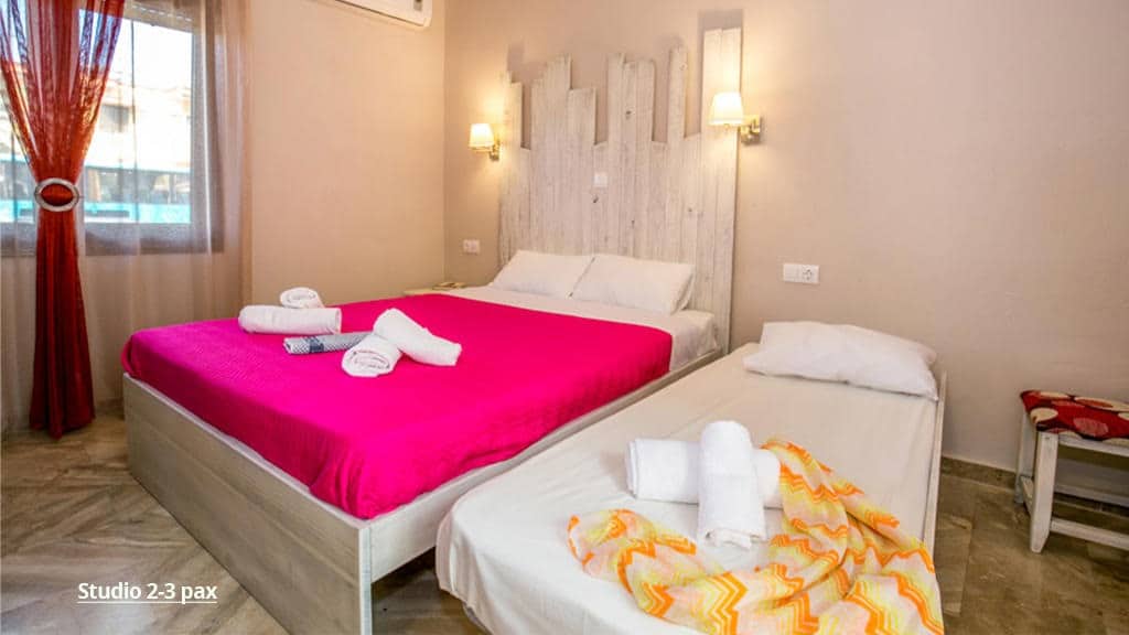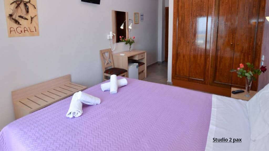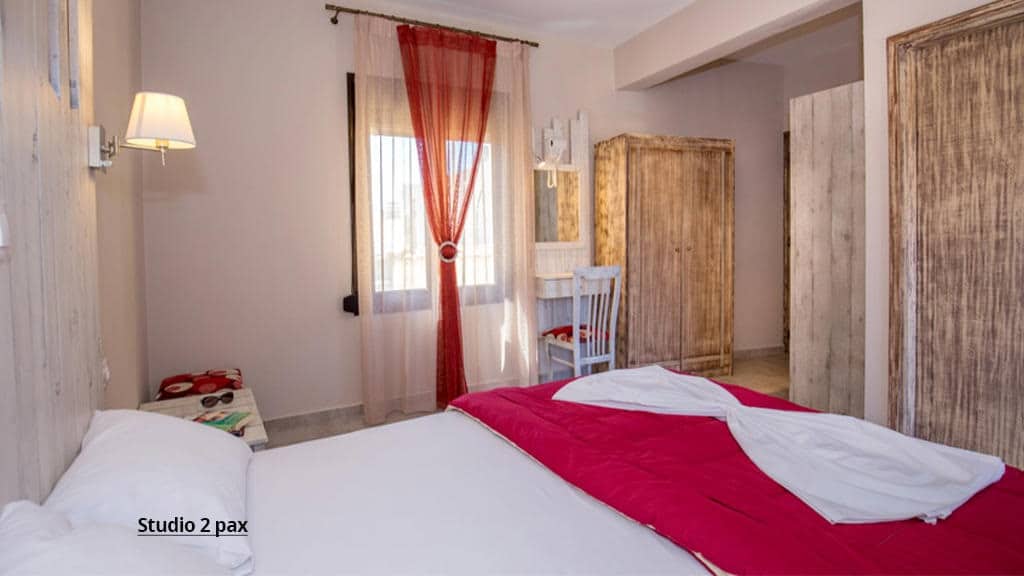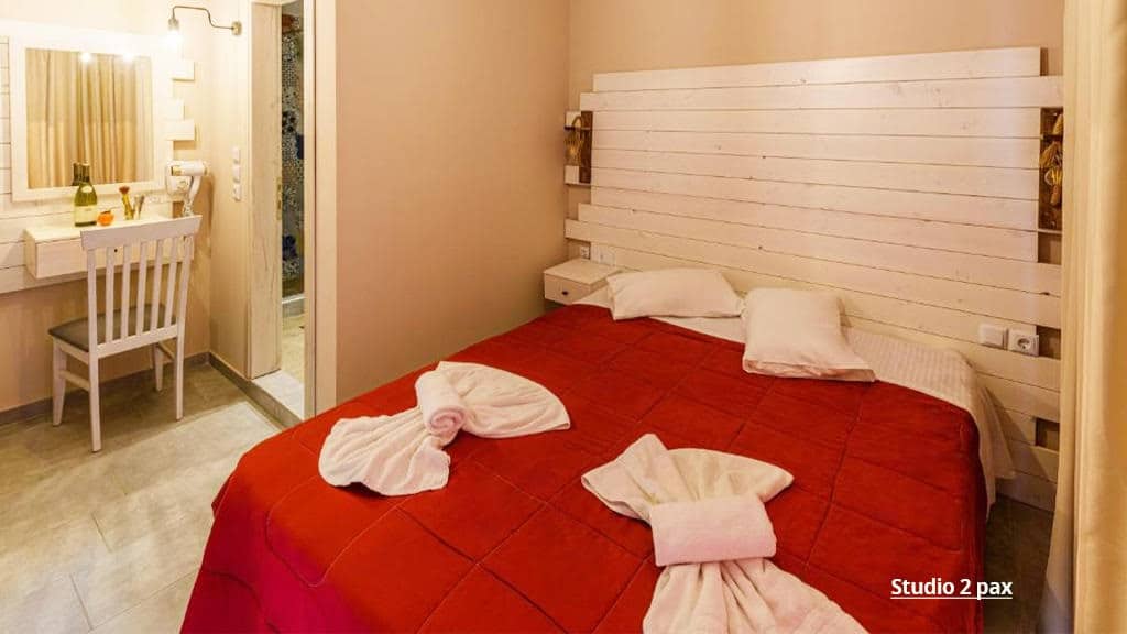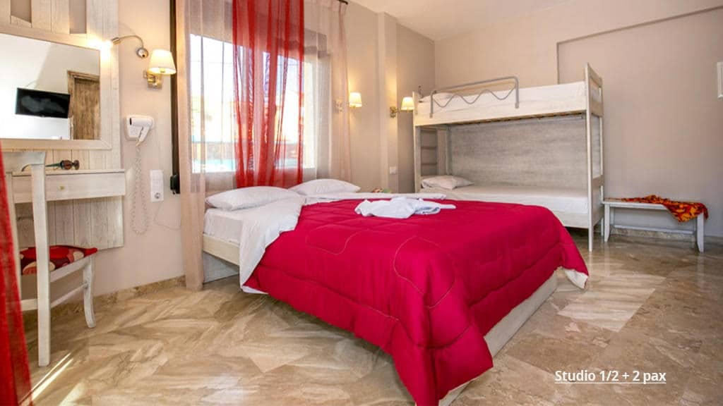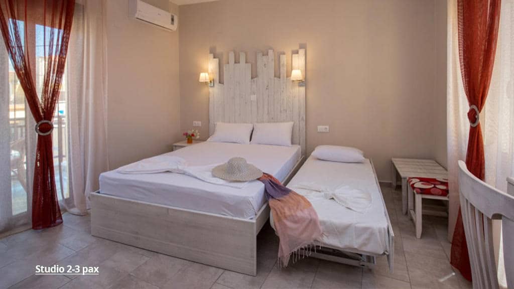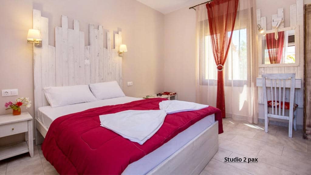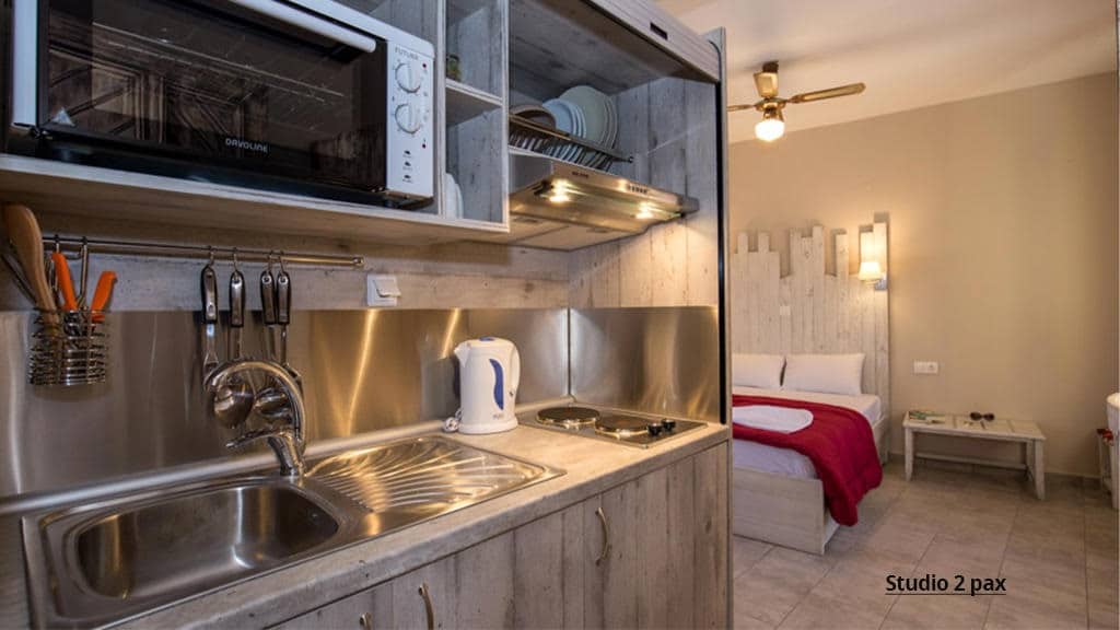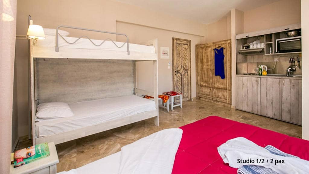 Vila raspolaže sa više tipova smeštajnih jedinica, uključujući standardne dvokrevetne i trokrevetne studio apartmane, kao i četvorokrevetne studije sa krevetima na sprat. Svi studiji sadrže kupatilo sa tušem/kadom, fen, balkon/terasu, klima uređaj, SAT TV, Wi-Fi i mini čajnu kuhinju za pripremu lakih obroka i napitaka. Dvokrevetni studio, površine oko 15 m², ima francuski ili dva odvojena ležaja i namenjen je za boravak dve odrasle osobe. Trokrevetni studio, površine oko 17 m², poseduje francuski ili dva odvojena ležaja, dok je treći ležaj pomoćni (žičani krevet ili sofa na rasklapanje), i namenjen je za smeštaj dve do tri osobe (dve odrasle osobe i dete uzrasta do 11,99god ili tri odrasle osobe). Četvorokrevetni studio, površine oko 25 m², ima francuski ili dva odvojena ležaja i krevete na sprat, i namenjen je za smeštaj dve odrasle osobe i dvoje dece uzrasta do 11,99 god.