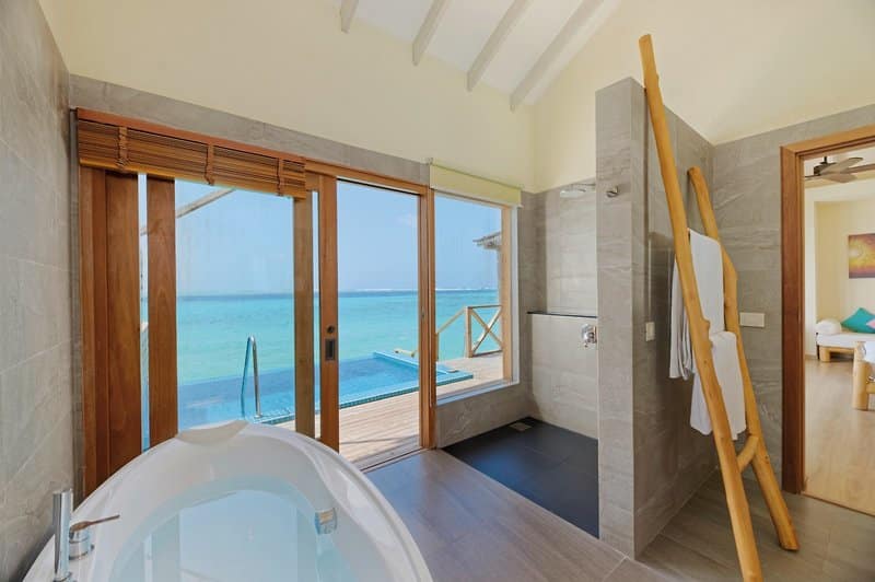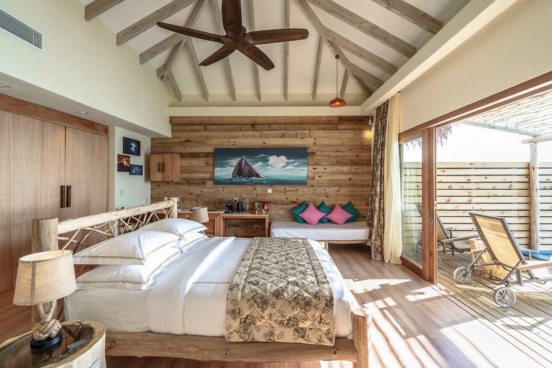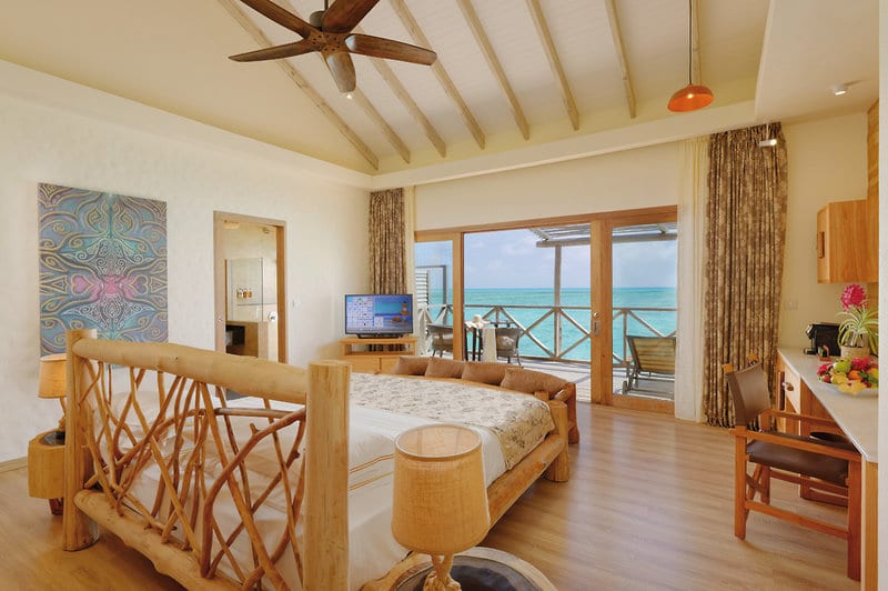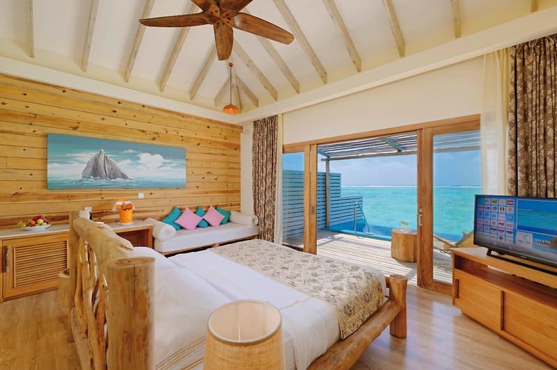 Parovi mogu odabrati vile iznad mora sa pogledom na izlazak sunca, one sa pogledom na zalazak, ili prostrane Beach Suite smeštene direktno na pesku uz privatni bazen i kadu pod otvorenim nebom. Tu su i Aqua Suite sa toboganom za direktan ulazak u more, koje dodatno unose osećaj zabave i opuštenosti. Sve sobe su klimatizovane, imaju privatno kupatilo, SAT TV, Wi-Fi, aparat za kafu i minibar uz doplatu.